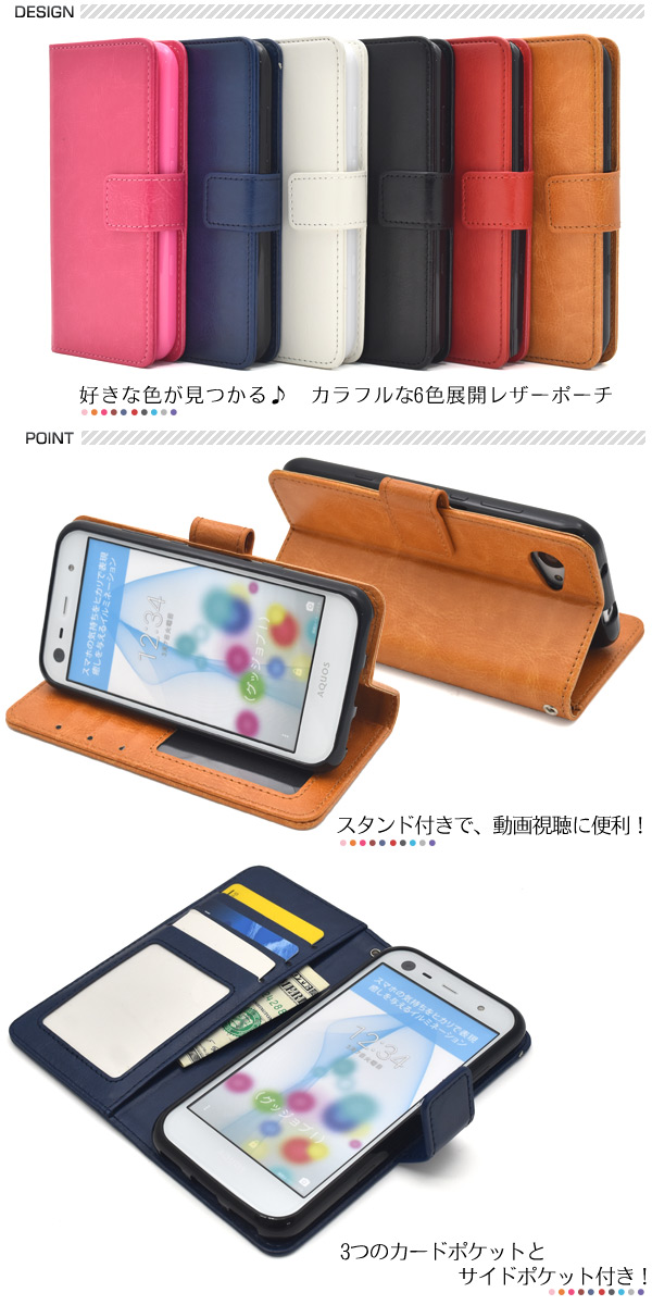 カラフルな6色展開のカラーレザースタンドケースポーチ。衝撃やキズなどからAQUOSを守ります。また、内部はソフトケースなので着脱が簡単です。 背面を折り返すとスタンドとして使用できるので、動画視聴に便利です。 落下防止に最適なストラップとストラップホール付きです。 横開きタイプなので、手帳のように使うことができます。また、内側に3つのカードポケットとサイドポケットが付いています。 ※AQUOSは付属しません。※ライセンス商品ではありません ※カードは付属しません。 ※ケースをつけたまま撮影できますが、フラッシュ撮影時にケースの色が移り込むことがあります。