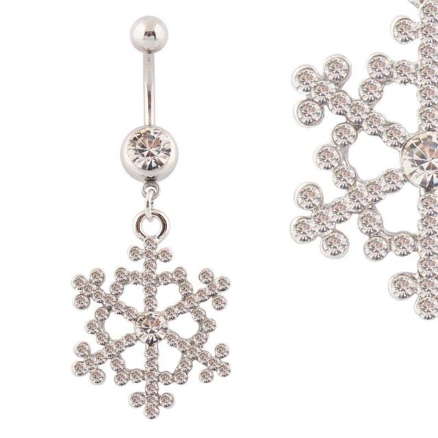 シンプルなクリスタルのキュービックジルコニアをセットしたサージカルステンレス316L製のへそピアスにクリスマスや冬にぴったりの雪の結晶をモチーフにしたチャームが揺れる鐘の音が聞こえてきそうな臍ピアス型ボディピアス。