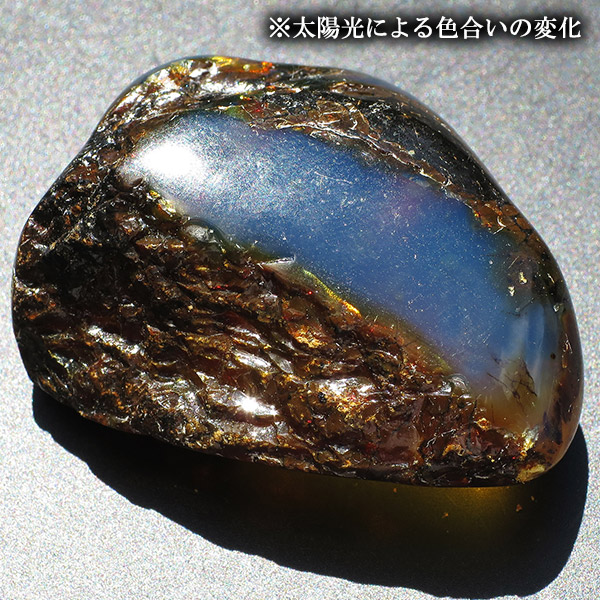ブラックライトなどの紫外線はもちろん、太陽光でも青色への変化を見ることができる、高品質なブルーアンバーです。