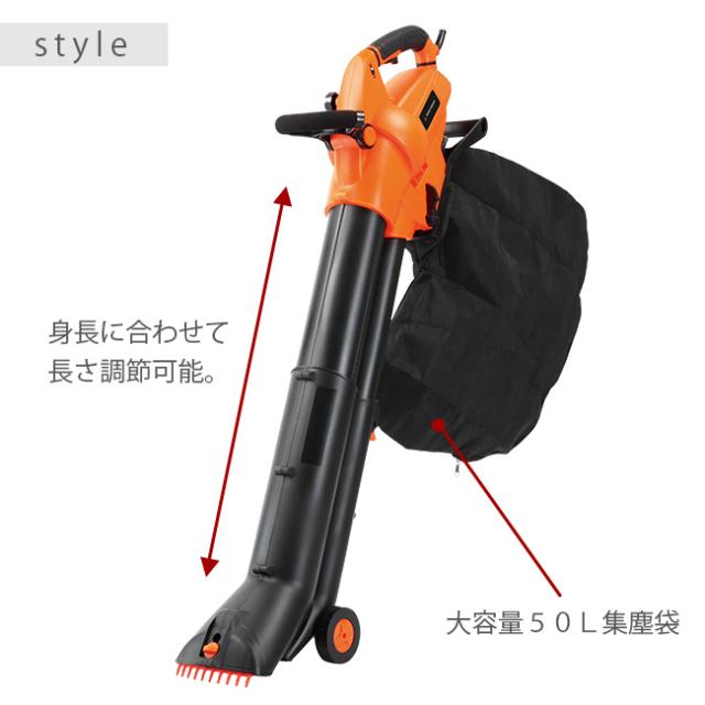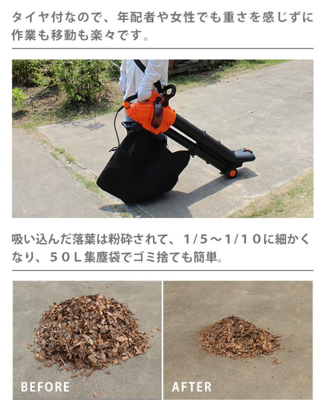また、ノズル先にはタイヤがついているので年配の方や女性でも重さを感じにくく、作業や移動も楽々。 たっぷり容量50リットルの集塵袋に吸い込んだ落ち葉は粉砕され、1/5〜1/10に細かくなるので処分も簡単です。
