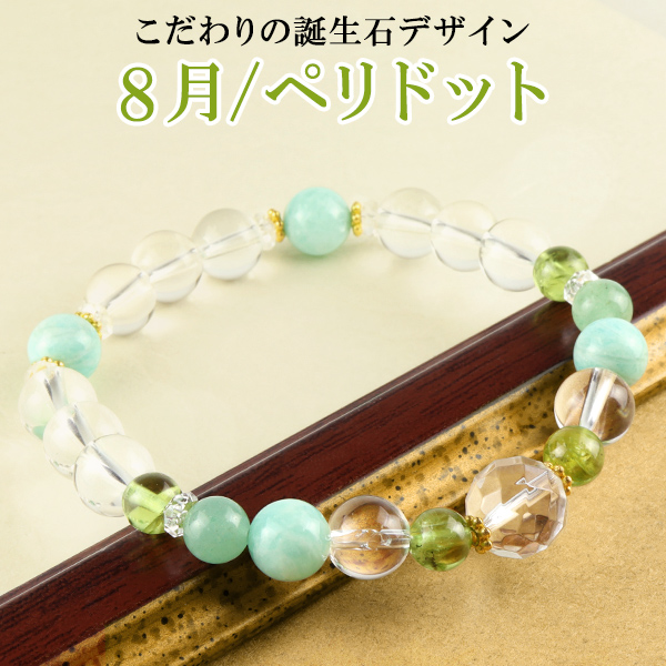 誕生石を取り入れたオリジナルブレスレット。8月の誕生石は太陽の下のオリーブを思わせる、鮮やかな黄緑のペリドット。