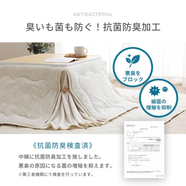| 【表地】 たれ部=ポリエステル100%(フランネル) 天板部=ポリエステル100%(フランネル) コーナー=ポリエステル100%(フランネル両面起毛) 【裏地】 ポリエステル100%(フランネル) 【中綿】 中空ポリエステル綿100%(抗菌防臭加工) |
