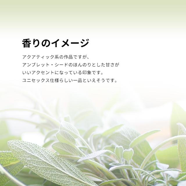 アクアティック系の作品ですが、アンブレット・シードのほんのりとした甘さがいいアクセントになっている印象です。ユニセックス仕様らしい一品といえそうです。ボトルやボックスも、いつもどおり格調高いデザインです。
