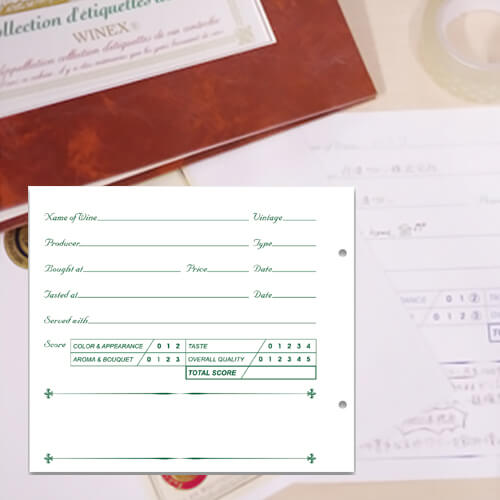●台紙記入項目:Name of Wine…ワインの名前、Vintage…年号、Producer…ワインの生産者、Type…タイプ(甘口、辛口など)、Bought at…購入したお店、Price…価格、Date…購入日、Served with…一緒に食べた料理、Score(段階)…色(012)味(01234)、香り(0123)全体評価(012345)、総合スコア、FreeSpace…フリースペース