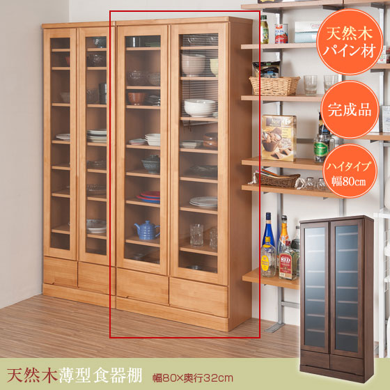 ガラス扉ですっきりお洒落に収納できる薄型食器棚。薄型だからあまり場所を取らず、圧迫感なく大量収納できます。使い込むほどに味のある飴色に変化する天然木パイン材を使用。天然木の優しい丸みを帯びた角を取ったフォルム、扉の取っ手部分は指にかけた時しっくりくる曲線で、ずっと眺めていたくなる飽きのこないデザインに仕上がっています。サイズは幅60と80それぞれロータイプ・ハイタイプをご用意しました。カラーはお部屋の雰囲気に合わせてナチュラルとブラウンの2色からお選び頂けます。安心・安全の日本製、届いてすぐにお使い頂ける完成品です。