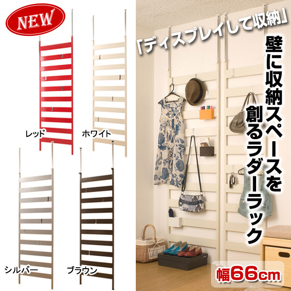 お部屋にちょっとしたアクセントを与え、貴方のアイデア次第でお部屋をショップのように演出できるNEWつっぱり式ラダーラック。ちょっとした壁面スペースを有効活用でき、お部屋をお洒落に演出してくれます。しっかりとした造りは国産ならではで、洗練された仕上がり感が他とは違います。スチール製のフックが4個付属しているので、玄関先に設置して帽子、バックなどを掛ければとっても効率的です。リビングに設置すれば、ハンガー掛けとしてもお使い頂けます。壁に貼りつけたり傷つける事なくフックが使用できる使い勝手の良い商品です。お部屋の雰囲気に合わせて選べるカラーはホワイト、シルバー、ブラウンに加えて、レッドが新登場!従来のつっぱり式ラダーラックよりもさらにお求め易く、新しく機能もプラスされたNEWつっぱり式ラダーラック。より便利な空間創りに大活躍してくれます。