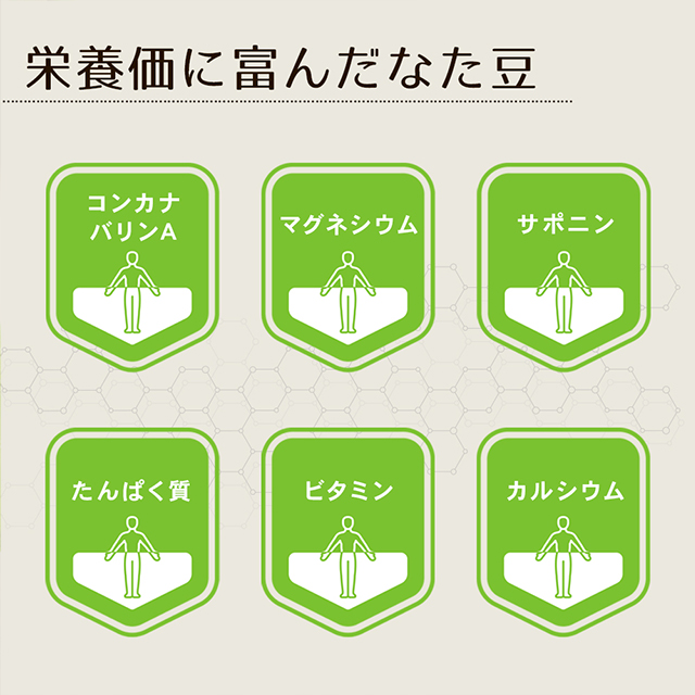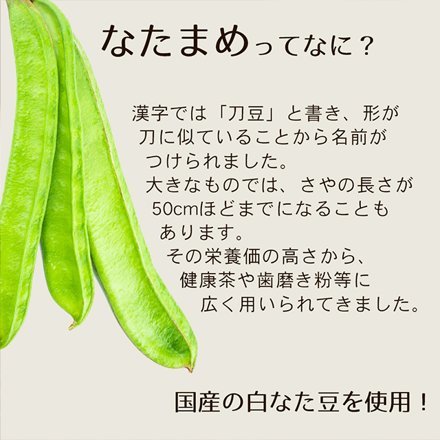 | コンカナバリンAがたっぷりのなた豆で今日も元気に! ナタマメという名前はさやが大きく固いため鉈(なた)を思わせるところから「なた豆・ナタマメ」とついたと言われています。 身近なところでは、福神漬けの材料等にもなっています。 なた豆は良質なタンパク質、サポニン、鉄分、ミネラル、ビタミン、ポリフェノール、食物繊維などを含む栄養価に富んだ食品です。 最近では、歯磨きだけではスッキリできない方などにもおすすめです。 ▼こんな方におすすめ ・季節の変わり目が気になる方 ・生活が不規則な方 ・人と接するお仕事をされる方 ・ニオイが気になる方 ・エチケットが気になる方 ・歯磨きだけではスッキリできない方 | |