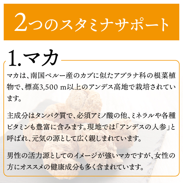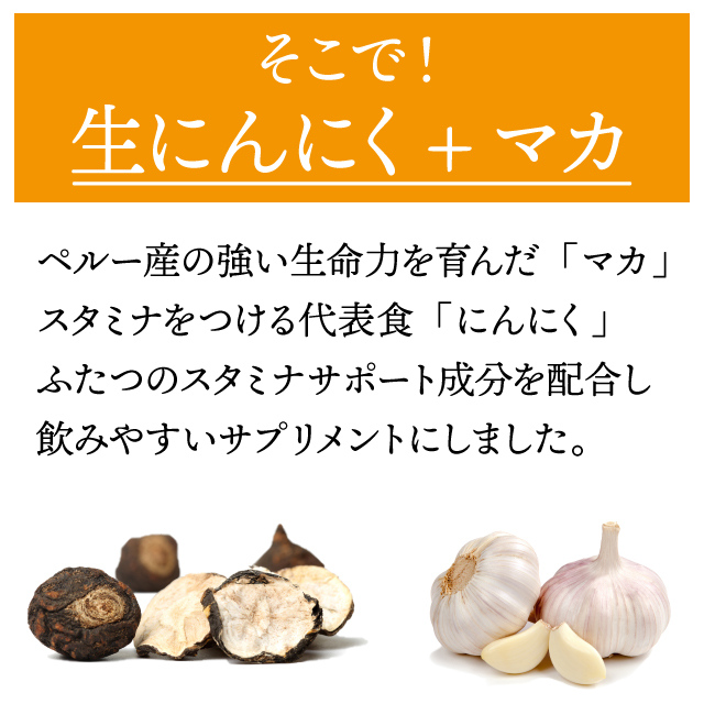 | 原材料 | デキストリン(国産)、マカ末(ペルー産)、にんにく末/ゼラチン |