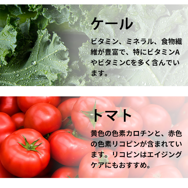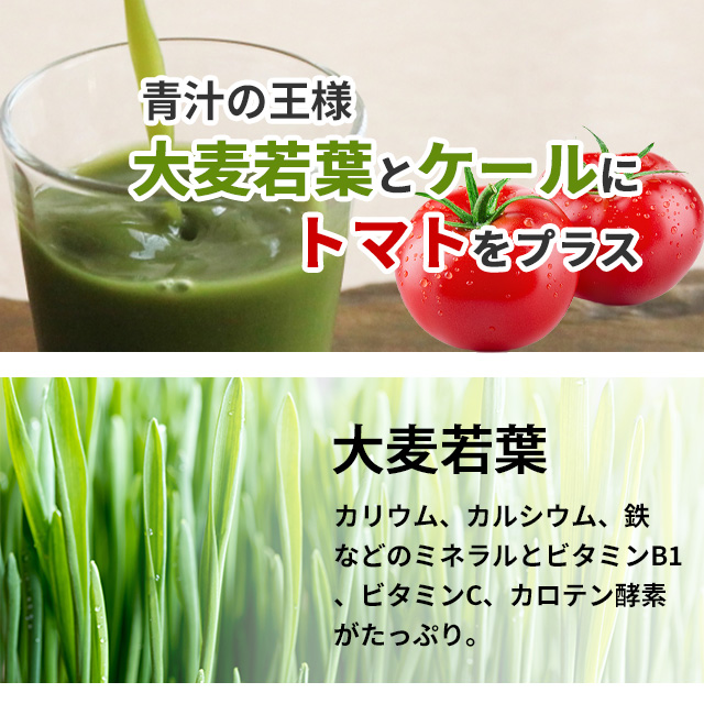 | 青汁の王様と言われる大麦若葉にリコピン豊富なトマトをプラス! 大麦若葉にはカリウム、カルシウム、鉄などのミネラルとビタミンB1、ビタミンC、カロテン酵素が多く含まれています。 リコピンは「カロテノイド」(赤や黄色、オレンジ色の色素)のひとつです。 トマトには、黄色の色素「カロチン」と赤い色素「リコピン」が含まれると言われています。 またリコピンは、エイジングケアにもおすすめされています。 ▼こんな方におすすめ ・野菜不足が気になる方 ・健康が気になる方 ・エイジングケアが気になる方 ・ダイエット中の方 ・美容が気になる方 | |