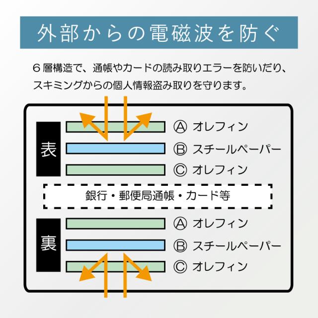 通帳やカードを外出先での「非接触式スキミング犯罪」から守ります。また、鞄などに使われている磁石まで様々な電磁波を弱め、磁気不良を防ぎます。
