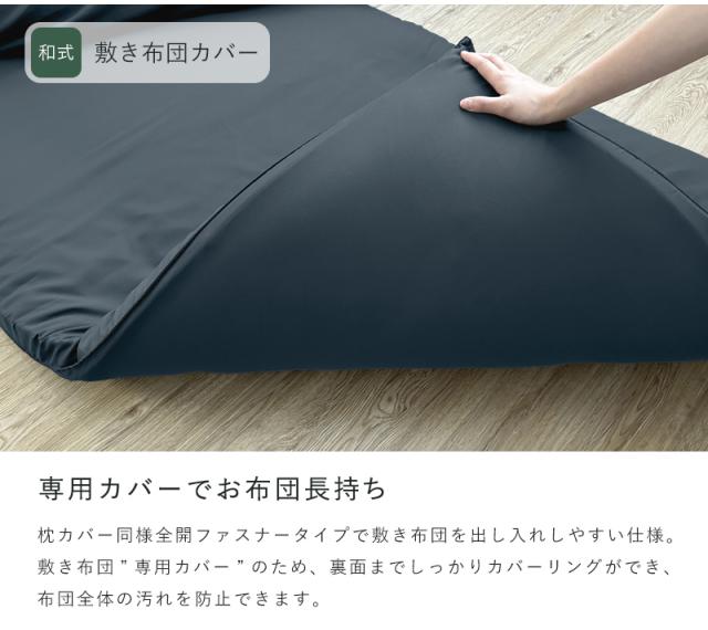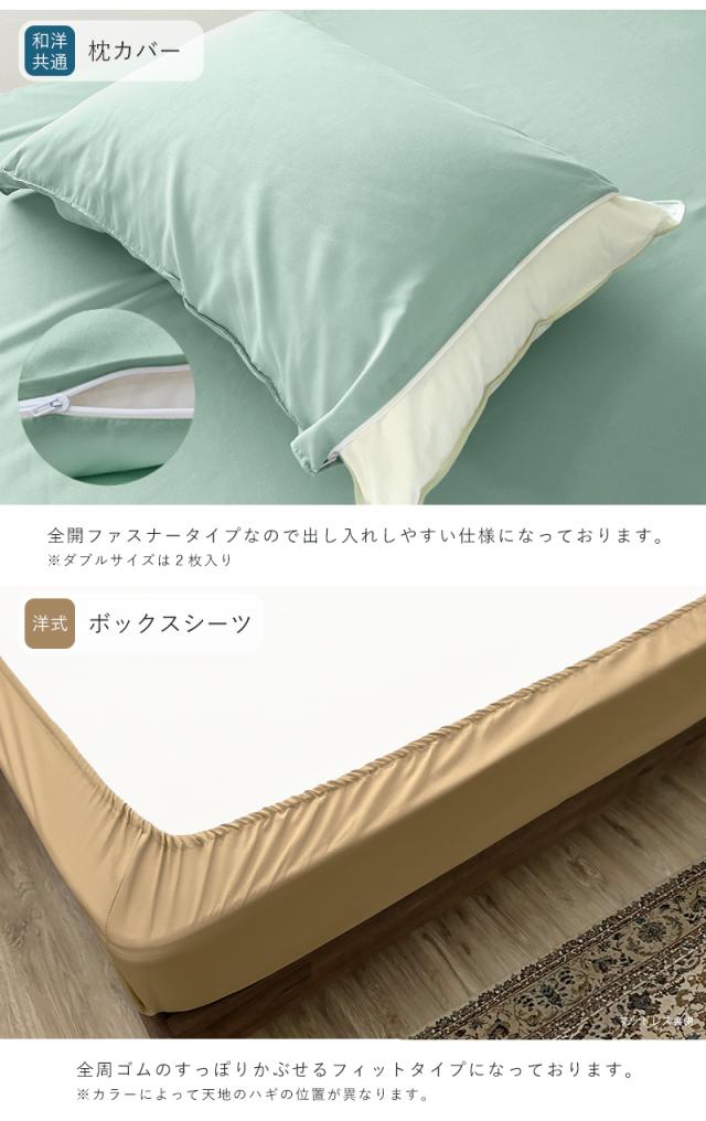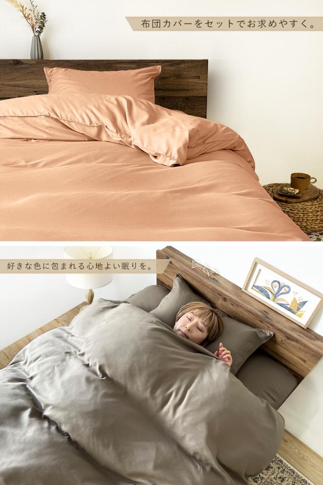 おなじ生地、同じ色で寝具をカバーリングすると統一感が生まれ、お部屋の雰囲気もまとまります。
