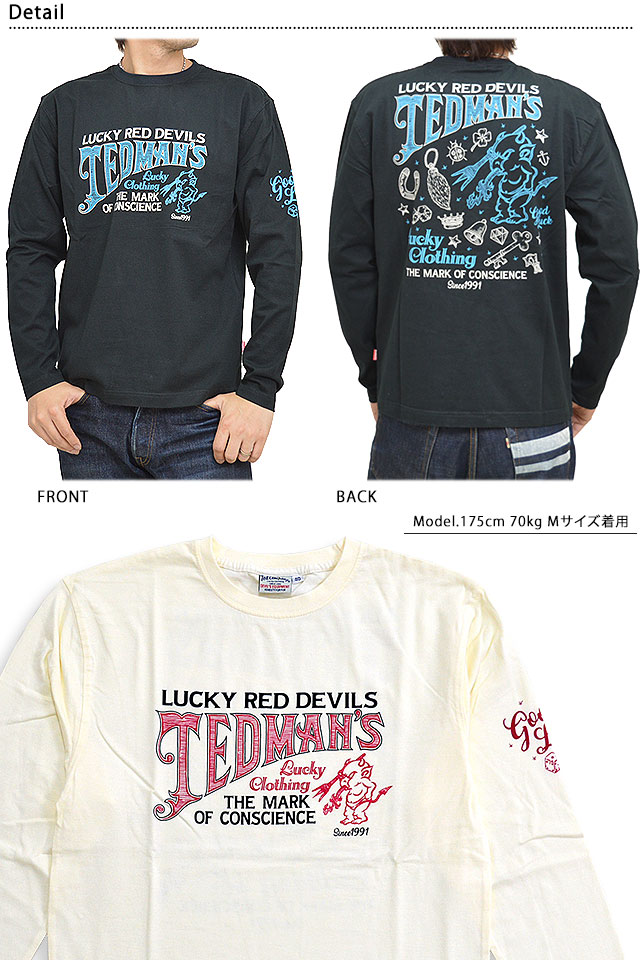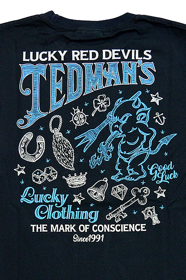 テッドマンから「Lucky Charms長袖Tシャツ(TDLS-309)」のご紹介です! 手描きで描かれたようなグラフィックを落とし込んだ、テッドマンデザインの中では秀逸なTシャツが登場。 フロントは中央に、バックと同じロゴとテッドマンが入ります。 カラーは2色。それぞれのボディーカラーに合わせて、アクセントカラーに変化が持たされており、 生地には、テッドマンお馴染のよれにくくタフなボディーを採用しています。 | ||||||||||||||||||||||||||||||