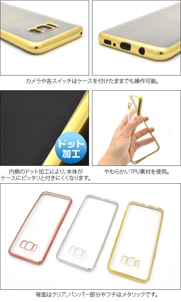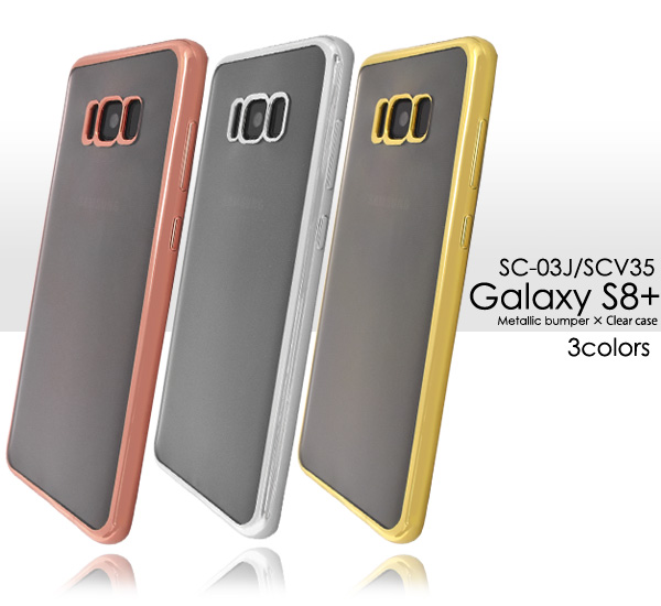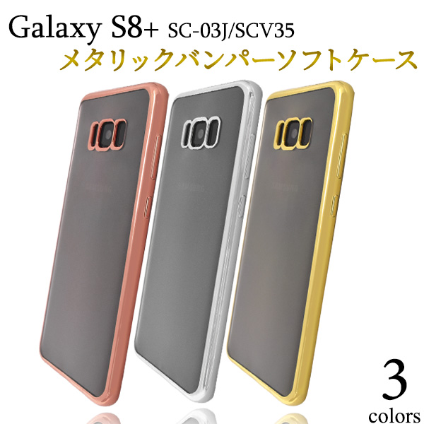Galaxy S8+ SC-03J/SCV35用のメタリックバンパーソフトクリアケース。 背面はクリア、バンパー部分やフチはメタリックのケースです。衝撃やキズなどからGalaxy S8+ SC-03J/SCV35を守るのはもちろん、カメラ、イヤホンや各種ボタンなどをケースに入れたまま操作可能です。ケース内側のドット加工処理により、本体がケースにぴったりと付くのが解消され、ケースが装着しやすくなります。※Galaxy S8+ SC-03J/SCV35は付属しません。※ライセンス商品ではありません。