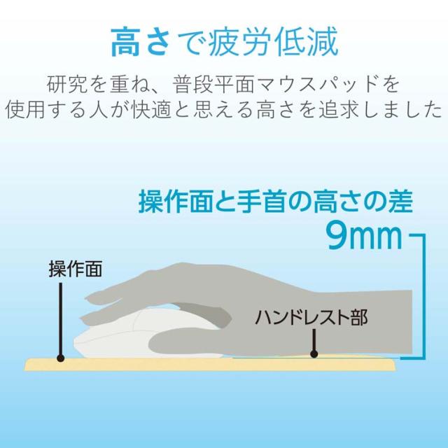 ●操作面とハンドレスト部の高さは、従来のハンドレスト付きMOUSE padの高さが気になる方や、平面MOUSE padをお使いの方に最適な0mmに設定しています。