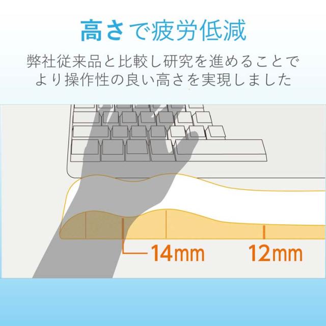 筋電位計測や体圧分散の試験評価によって導き出された、操作性の良い高さを実現。キーボードのスペースキーを親指で押す際に、邪魔にならないよう本体中央部分は低くしています。キーボードを打つ際に自然とできるハの字の形状をそのままパームレストに施した、今までにない「手首に優しくフィットするカタチ」です。
