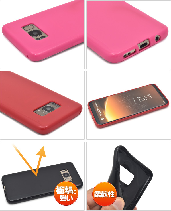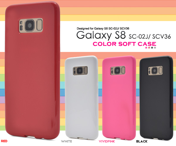 4色から選べるGalaxy S8 SC-02J/SCV36用カラーソフトケース。ポップなカラーに美しい光沢感を備えた、ソフトケースです。 素材は適度な硬さと弾力性をあわせ持つTPUを採用。 衝撃に強く耐久性に優れ、手触りも抜群です。もちろん、装着したまま充電や各種ボタンの操作も行えるようにデザインされています。
