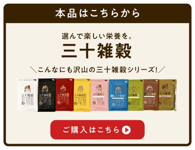 三十雑穀(黒):胚芽押麦(佐賀、熊本、大分)、もち玄米(福岡、熊本、大分)、丸麦(佐賀、福岡)、発芽もち黒米(福岡、香川、滋賀、熊本、佐賀、兵庫)、もち麦(福岡、熊本)、発芽玄米(福岡、熊本)、発芽もち赤米(福岡、熊本、香川、茨城、秋田、岡山)、黒大豆(黒千石66%(北海道)、黒豆34%(北海道))、うるち玄米(福岡、熊本)、はだか麦(福岡、熊本、愛媛、滋賀)、米粒麦(佐賀、福岡)、発芽もち玄米(福岡、熊本、大分、北海道)、黄大豆(福岡、佐賀、北海道)、焙煎もち玄米(福岡、熊本、大分、北海道)、小豆(北海道)、焙煎玄米(福岡、熊本)、焙煎大豆(焙煎黄大豆(福岡、熊本、北海道))、たかきび(北海道)、青大豆(北海道、福岡)、発芽もち緑米(栃木)、もちきび(北海道、長崎)、もちあわ(北海道、長崎)、ハト麦(北海道、島根、富山)、とうもろこし(北海道、熊本)、ひえ(北海道、熊本)、玄ハト麦(北海道、島根、富山)、もち黒米(紫こぼし100%(福岡、熊本))、手芒豆(北海道)、なた豆(福岡、熊本)
