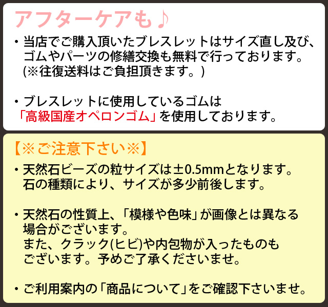 ●世界で一つだけの天然石との出会いは偶然ではありません。パワーストーンとの縁も貴重な出会いのひとつです。一つ一つ表情の違う石の個性をお楽しみいただければ幸いです。