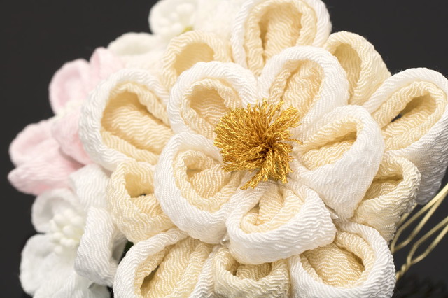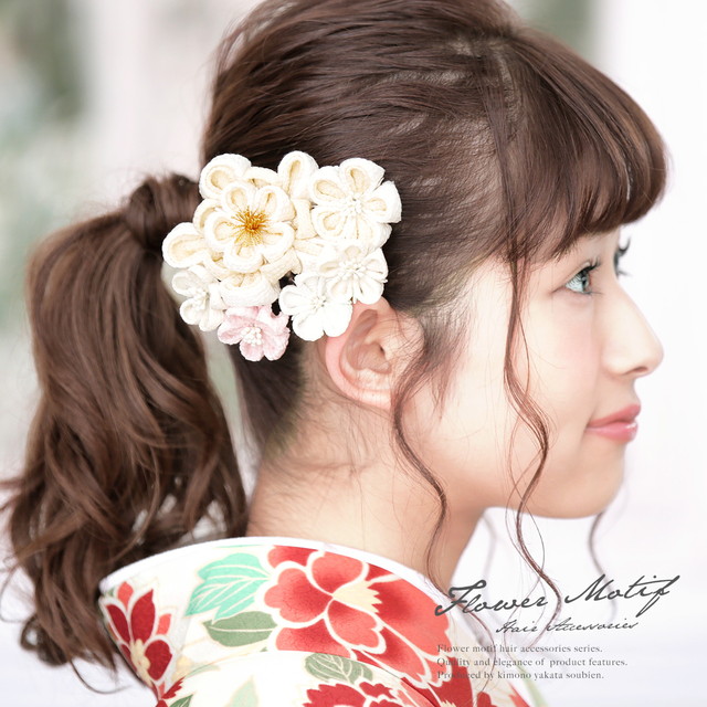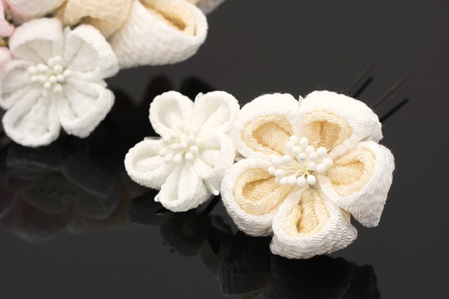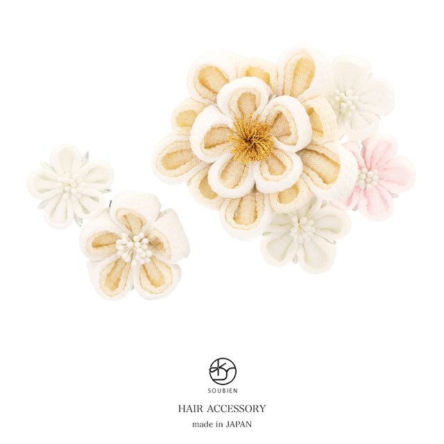 成人式 髪飾り 成人式の髪飾り つまみ細工 2点セット 白 ホワイト ライトベージュ ピンク 菊 梅 花 縮緬 ちりめん コサージュ コーム Uピン 髪留め 卒業式向け 振袖向け 袴向け ヘアアクセサリー 日本製 和装