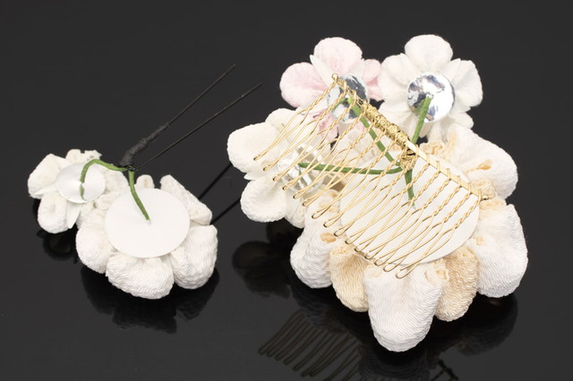 大きな髪飾りはコーム式、小さな髪飾りはUピン式です。