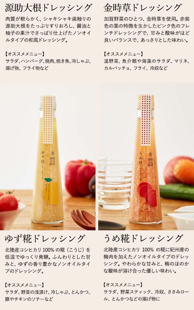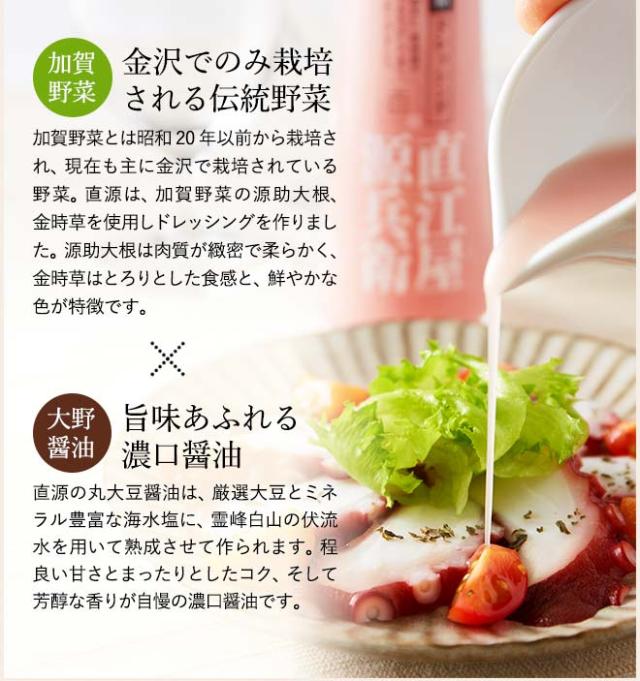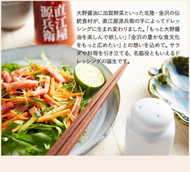 かつて、加賀百万石の城下町として栄えた金沢は、”食”も魅力の一つです。その金沢の名産品のひとつが、大野醤油。 味はまろやかでコクがあり、さらに甘味があるために「うまくち醤油」とも称されています。 その大野醤油の老舗蔵元「直江屋源兵衛」が、醤油や加賀野菜などを用いて、個性が光るドレッシングを作りました。サラダのみならず、パスタや冷しゃぶ、揚げ物等様々な味わい方ができます。 サラダがもっと美味しくなる、レシピの幅もどんどん広がる、ドレッシングギフトセットです。 |