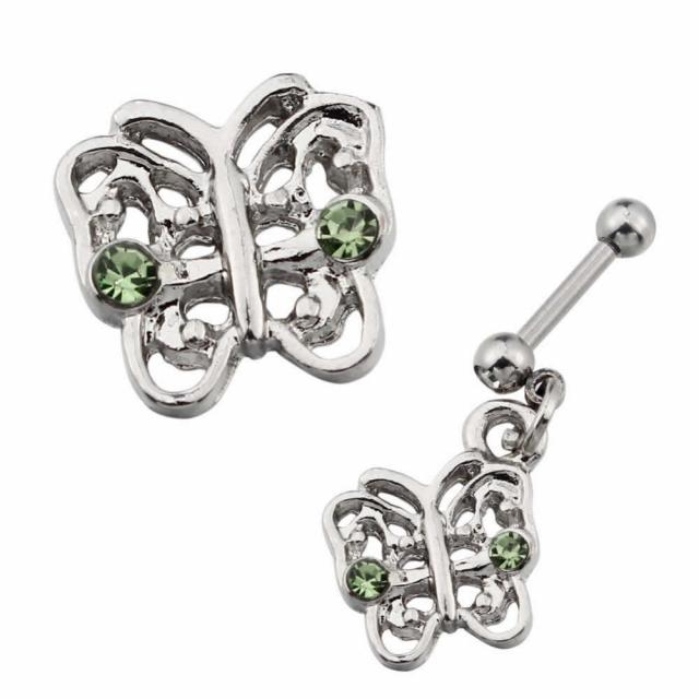 クリスタルのジルコニアをセットした16Gのストレートバーベルに黄緑色のペリドットのジルコニアをセットしたチョウチョウのチャームが揺れるボディピアス。耳たぶのイヤーロブだけでなく軟骨ヘリックス、トラガスにもおすすめのボディーピアスです。レディースに人気の蝶々のモチーフなのでプレゼントにもおすすめ。激安の揺れるヘリックスピアス。どちら側のネジボールも取り外しができるので、軟骨ピアスの装着も簡単。しかもネジキャッチをサーキュラーバーベルやバナナバーベルに付け替えてボディピアスパーツとしても使えます。【スペック】
