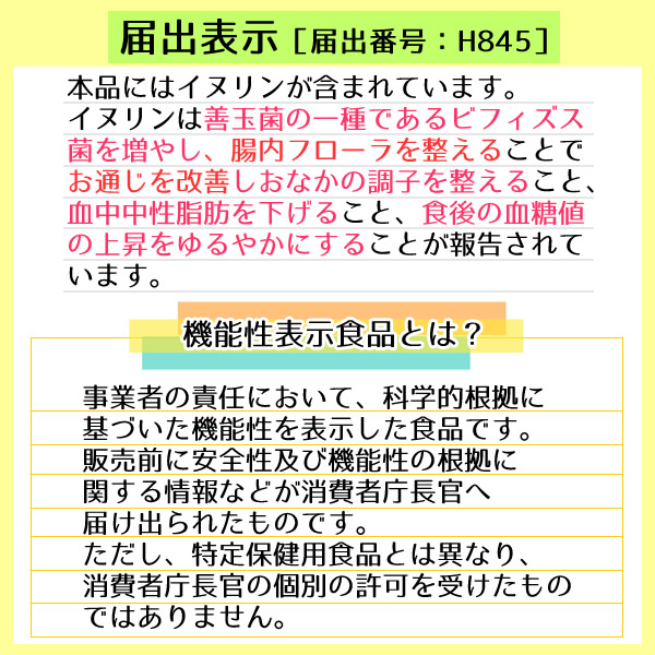 本品は【機能性表示食品】です。届出表示[届出番号:H845] 本品にはイヌリンが含まれています。 イヌリンは善玉菌の一種であるビフィズス菌を増やし、腸内フローラを整えることでお通じを改善しおなかの調子を整えること、血中中性脂肪を下げること、食後の血糖値の上昇をゆるやかにすることが報告されています。 機能性表示食品とは? 事業者の責任において、科学的根拠に基づいた機能性を表示した食品です。 販売前に安全性及び機能性の根拠に関する情報などが消費者庁長官へ届け出られたものです。 ただし、特定保健用食品とは異なり、消費者庁長官の個別の許可を受けたものではありません。 機能性表示食品・イヌリンの4つの効果! (1)ビフィズス菌を増やし腸内フローラを整える イヌリンは、腸内のビフィズス菌のえさになるので、イヌリンを食べたビフィズス菌が増え、腸内フローラを整えてくれます。 ・腸内フローラとは・・・ 腸内に棲んでいる細菌は、菌種ごとの塊となって腸の壁に張り付いています。 その様子がお花畑(flora)に似ていることから、【腸内フローラ】と呼ばれるようになりました。 善玉菌が多い【腸内フローラ】に整えることが、健康に大切と考えられています。 (2)お通じを改善する 腸内フローラが整うと、便秘傾向者の排便回数と排便量が増え、おなかの調子も整います。 (3)血中中性脂肪を下げる ビフィズス菌は、イヌリンを食べて増えるのと同時に、短鎖脂肪酸などをつくり、それが体の中で作用することでエネルギー消費量が増え、中性脂肪や食欲を抑え、脂質代謝を改善することで、血中中性脂肪を下げます。 (4)食後血糖の上昇をゆるやかにする イヌリンを摂ることで、パンや米などに含まれる糖を小腸で吸収するのを抑えるため、食後血糖の上昇をゆるやかにします。 便秘でお悩みの方・食物繊維が不足しがちな方・健康・美容を心がけている方・血糖値が気になる方・腸内フローラを整えたい方・ダイエットを頑張っている方……このような方に、4つの機能性イヌリンがおすすめです! ■お召し上がりの目安■ 1日の摂取目安は9gです。9g中に、機能性関与成分イヌリン 8.1gが含まれています。 お好きなものに混ぜるなどしてお召し上がりください。 ※食事は主食、主菜、副菜のバランスを心がけましょう。 ※急に摂取するとお腹が緩くなる可能性があります。少量からお試しください。 ※賞味期限は未開封の状態で保存した場合の期限となります。 開封後は期限に関わらずお早めにご使用ください。 ※極まれに製造工程上で、イヌリンが糖褐変した茶褐色の粉末が混じることがございますが、品質等には問題ございません。 |
