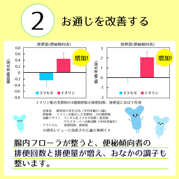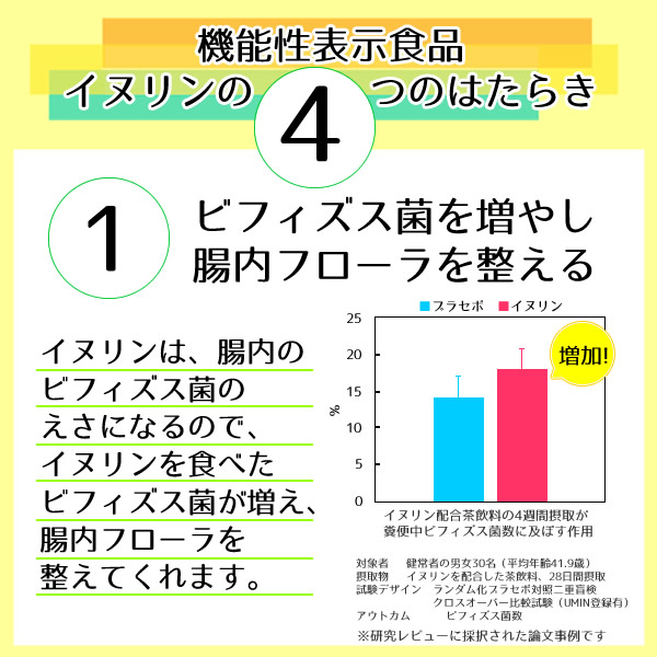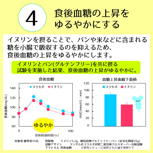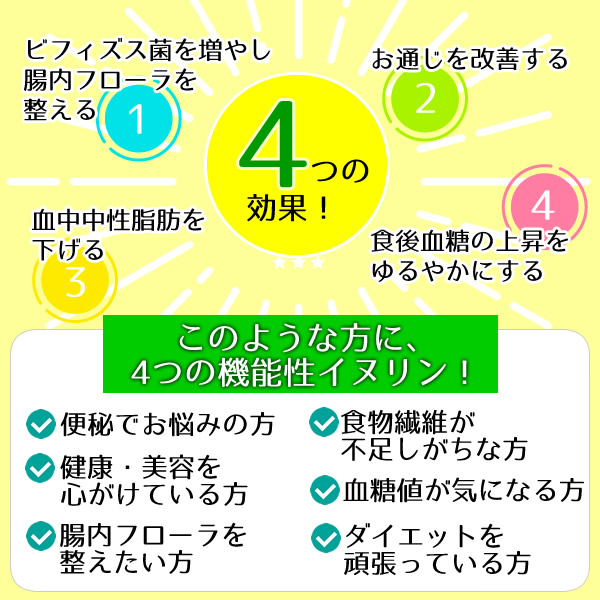 イヌリンは善玉菌の一種であるビフィズス菌を増やし、腸内フローラを整えることでお通じを改善しおなかの調子を整えること、血中中性脂肪を下げること、食後の血糖値の上昇をゆるやかにすることが報告されています。