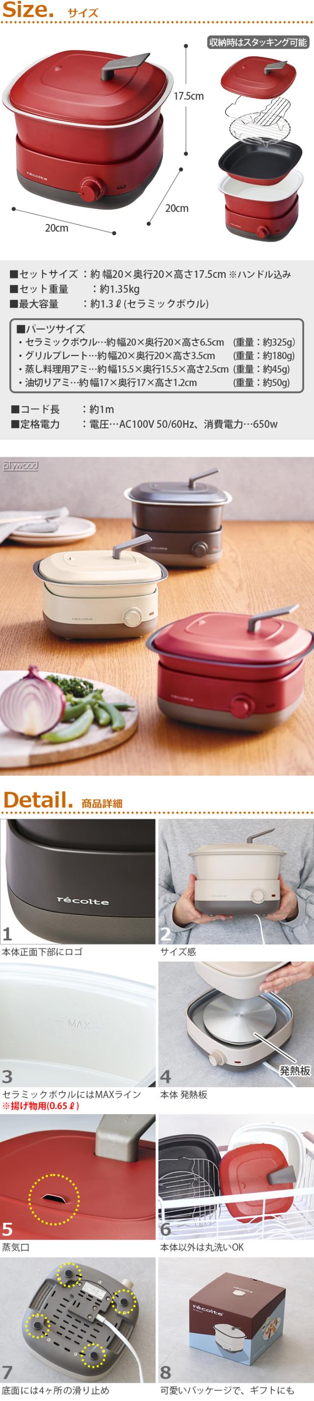 | セットサイズ:(約)幅20×奥行20×高さ17.5cm(ハンドル込み) セラミックボウル:(約)幅20×奥行20×高さ6.5cm グリルプレート:(約)幅20×奥行20×高さ3.5cm 蒸し料理用アミ:(約)幅15.5×奥行15.5×高さ2.5cm 油切りアミ:(約)幅17×奥行17×高さ1.2cm |