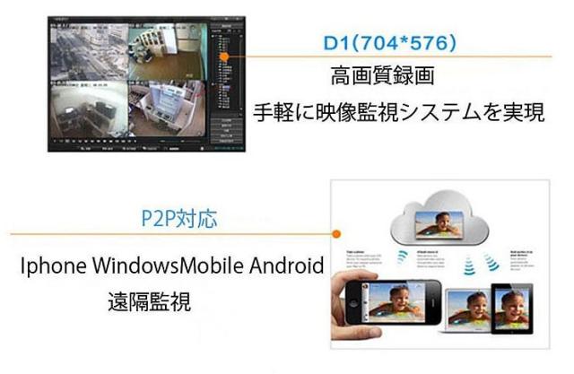 ★P2P対応。スマートフォン等でどこからでもリアルタイム監視や遠隔操作ができます。