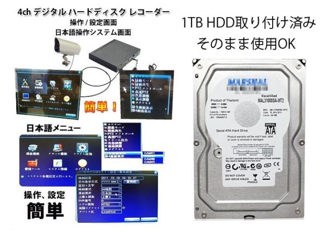防犯カメラ・DVRレコーダーセット カメラ4台付属 P2P対応 スマホで遠隔監視・操作可能 1TBハードディスク装備 防水・暗視 DVR4CHDDset