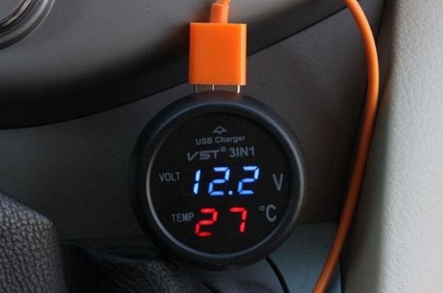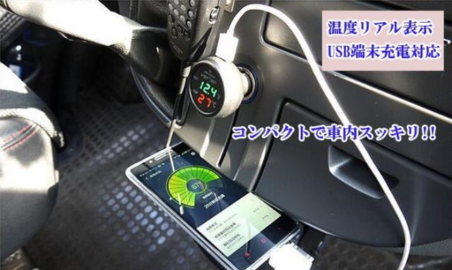 車載マルチ電圧計+温度計+USBチャージャー 3in1 シガーソケットに挿すだけ バッテリー電圧表示 温度表示 VST31