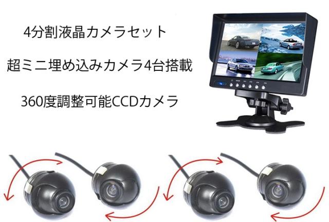 バックカメラセット 7インチ4分割表示液晶 超ミニCCDカメラ4台 正像/鏡像切替 埋め込みタイプ ガイドライン調節可能 mn7114set