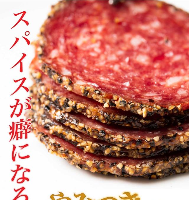 【原材料名】:豚肉、馬肉、牛肉、豚脂肪、糖類(粉末水あめ、砂糖)、食塩、大豆たん白、香辛料、ブラックペッパー/調味料(アミノ酸等)、リン酸塩(Na)、pH調整剤、酸化防止剤(ビタミンC)、発色剤(硝酸K、亜硝酸Na)、(一部に豚肉・牛肉・大豆・ゼラチンを含む)