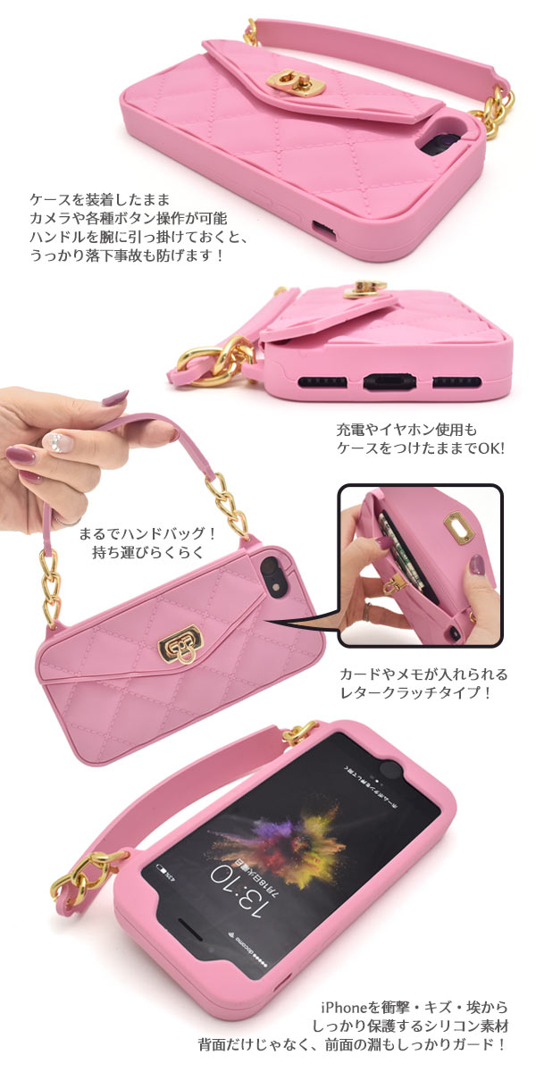 実際のレタークラッチバッグと同様にカードなどを入れられるポケットになっている便利なシリコンケース。シリコン素材なので、傷や埃などからiPhoone7をしっかりガード。カメラ、イヤホンや各種ボタンなどをケースに入れたまま操作可能です。やわらかく収縮性があるので、着脱も簡単!ハンドルに手を通せば、とっさの落下事故も防ぎ、可愛く持ち運びできます! ※iPhoneは付属しません。※ライセンス商品ではありません。※スクエアサイズでのフラッシュ撮影時にケースの色が移りこみます。