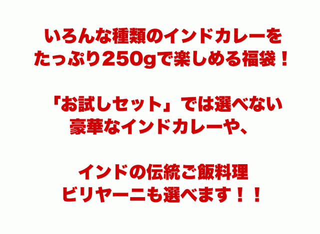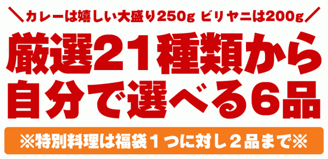 内容量:インドカレー各種(250g) 、ビリヤニ各種(200g) ※対象料理から選べる福袋です