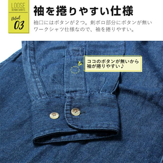 | 商品詳細 | シンプルなデニムシャツ。 普段着はもちろん、しっかりした生地なので作業着や、肌寒い日のジャケットとしても♪ 着回しもしやすいシンプルさが人気です。 |