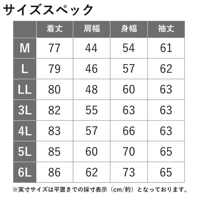 | サイズ | 【表記サイズ】 5L: 身長 175cm〜185cm / 胸囲 128cm〜136cm 6L: 身長 175cm〜185cm / 胸囲 136cm〜144cm ※各サイズ詳細は画像内の表をご参照ください。 |
