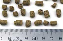 長さ約3〜8mm・直径6〜7mmの不均一のペレット状で噛み易い硬さになっています。