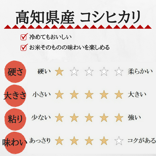 - 高知県産のコシヒカリ、美味しかったです。 家族にも好評でした。またリピートしたいと思いました。