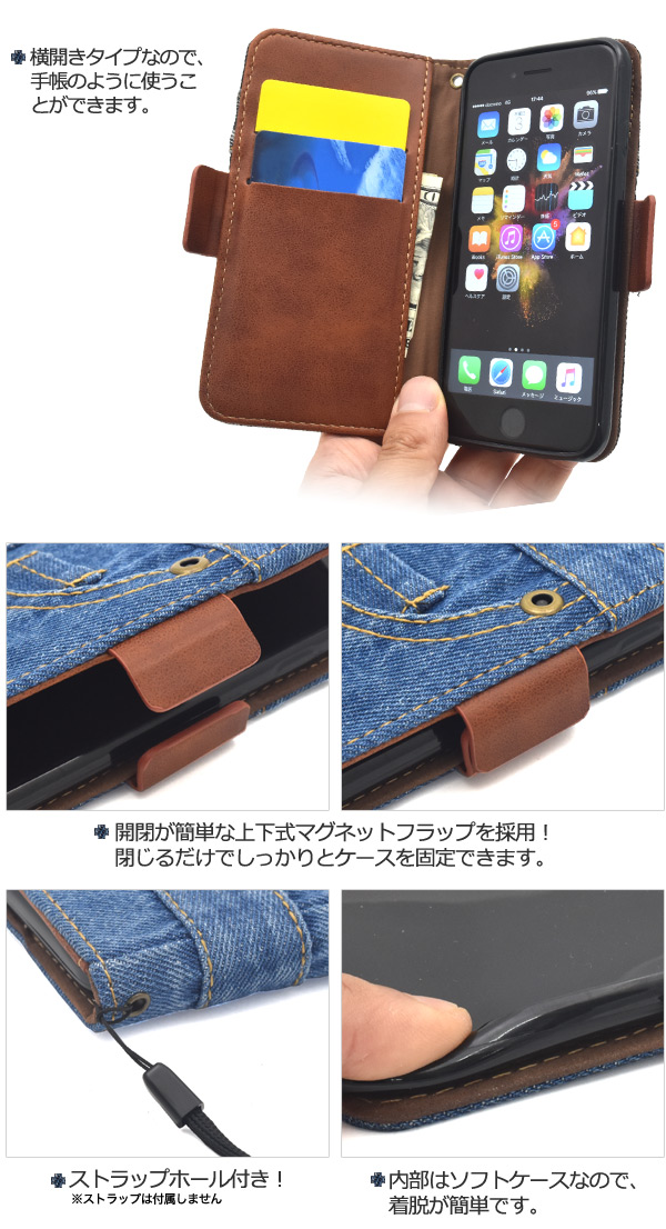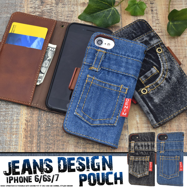 ジーンズデザインの手帳型ケースポーチ。衝撃やキズなどからiPhoneを守ります。 内部ケースはソフトケースなので、着脱が簡単です。