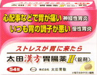| 特徴 | ストレスの溜まりすぎで、胃の調子を悪くした時 ストレスや神経の使いすぎで胃の調子を悪くした時(神経性胃炎)に服用する胃腸薬です。 神経性胃炎とは、神経の使いすぎで自律神経の失調を起こし、 交感神経・副交感神経のバランスがくずれ、胃の働きに支障をきたした時の状態をいいます。 太田漢方胃腸薬II はこれを正常に近づけ、胃腸機能を改善する効果が特徴です。 食べすぎ、飲みすぎの胃腸薬ではありません 食べすぎ、飲みすぎでないのに胃の調子がおかしいという時は、ストレスによる場合が多いようです。 そのような時にこの薬をお試し下さい。 安中散に茯苓を加えたことが特徴です 茯苓(ぶくりょう)は中国の松の根に出来るキノコの一種の菌体です。 中国ではお子様のひきつけや夜泣きに用いる生薬です。 安中散に精神安定作用のある茯苓を加えることにより、ストレスからくる神経性胃炎や慢性胃炎への効きめを強化しました。 |