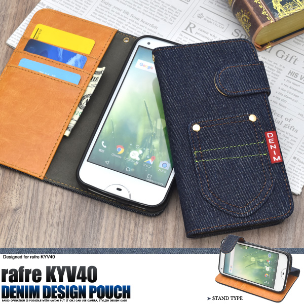 手帳型 rafre KYV40 デニム デザインケース かわいい きれい カジュアル ラフレスマホカバーKYV40用 保護カバー ジーンズ au 手帳 横開き