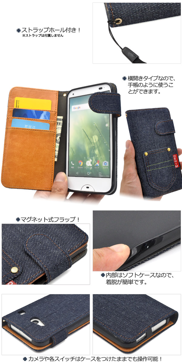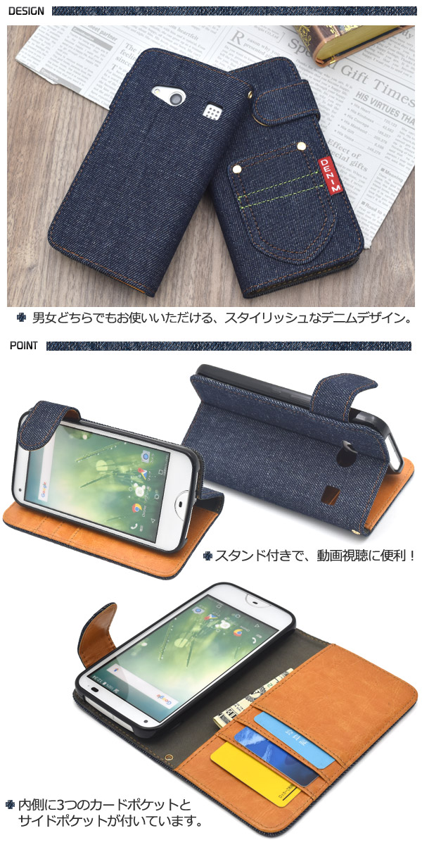 デニムデザインの手帳型ケースポーチ。衝撃やキズなどからrafre KYV40を守ります。 内部ケースはソフトケースなので、着脱が簡単です。 男女どちらでもお使いいただける、スタイリッシュなデニムデザイン。 内側は落ち着いたレザーデザインです。 落下防止に便利なストラップホール付きです。また、内側に3つのカードポケットとサイドポケット付きです。※rafre KYV40は付属しません。※ライセンス商品ではありません。 ※ケースをつけたまま撮影できますが、フラッシュ撮影時にケースの色が移り込むことがあります。