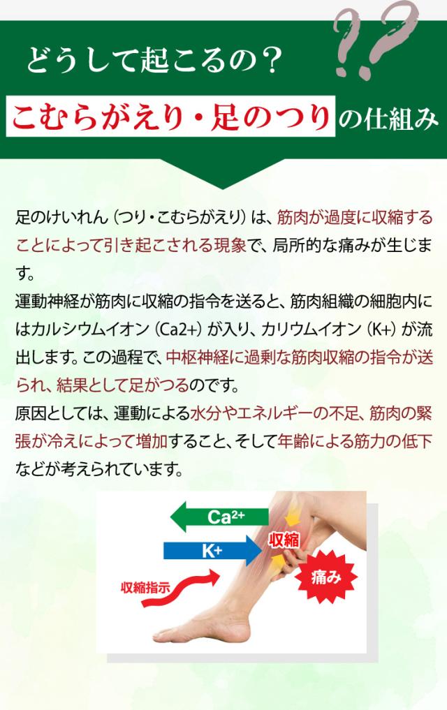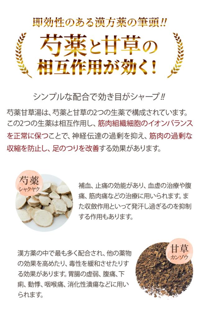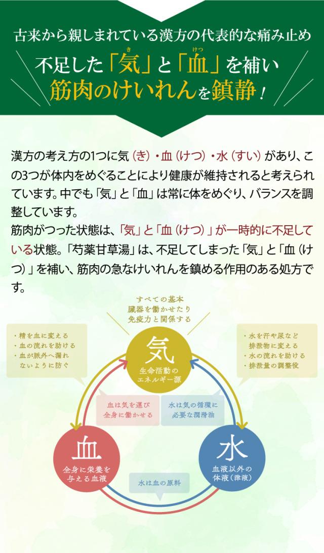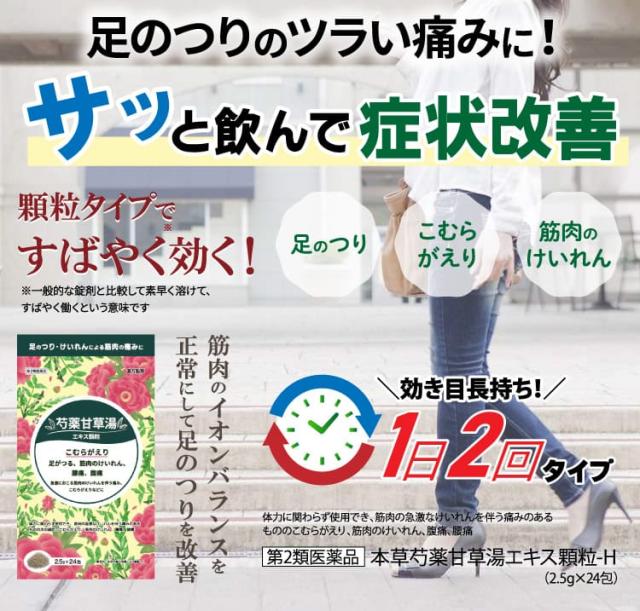 【効能・効果】体力に関わらず使用でき、筋肉の急激なけいれんを伴う痛みのあるものの次の諸症: こむらがえり、筋肉のけいれん、腹痛、腰痛
