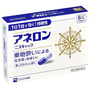 ●アネロン「ニスキャップ」は、乗物酔いによる吐き気・めまい・頭痛といった症状の予防・緩和にすぐれた効果をあらわすカプセル剤です。
