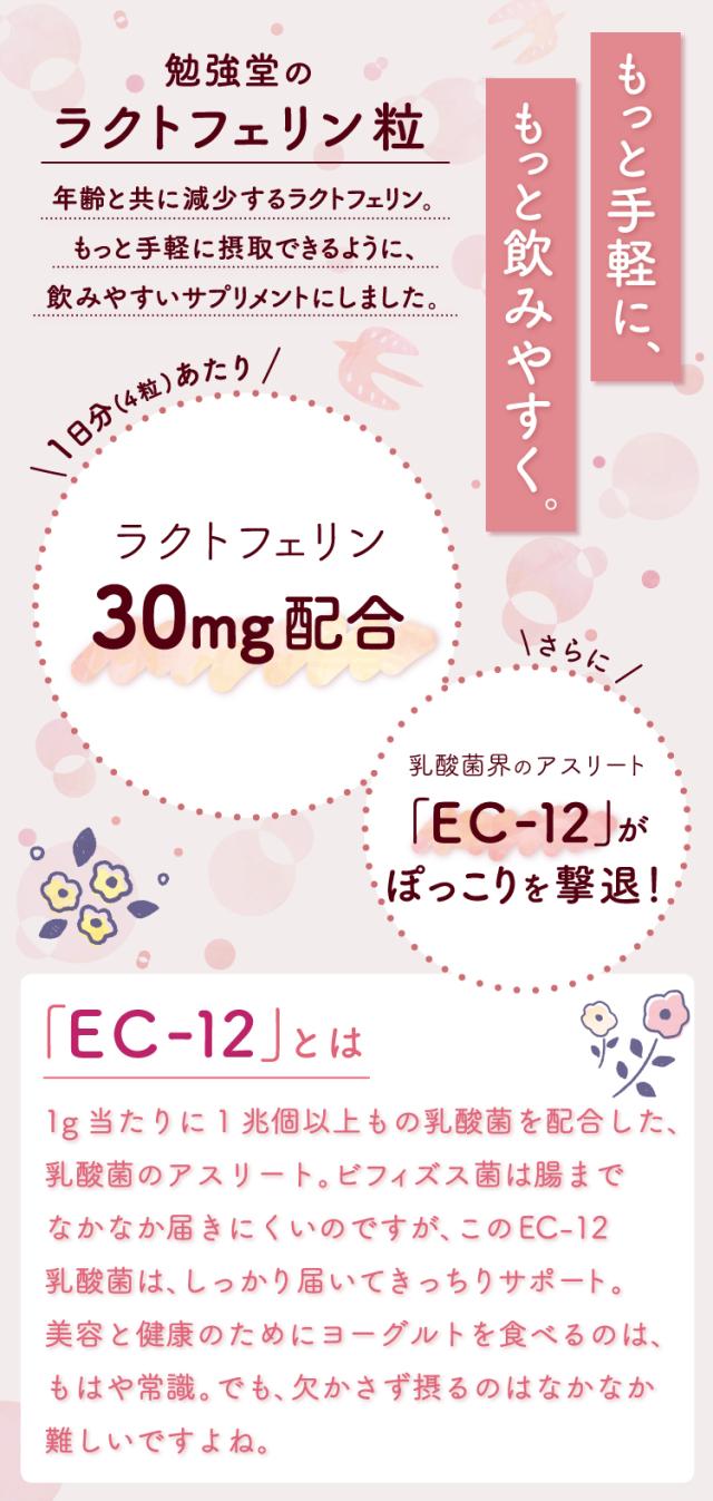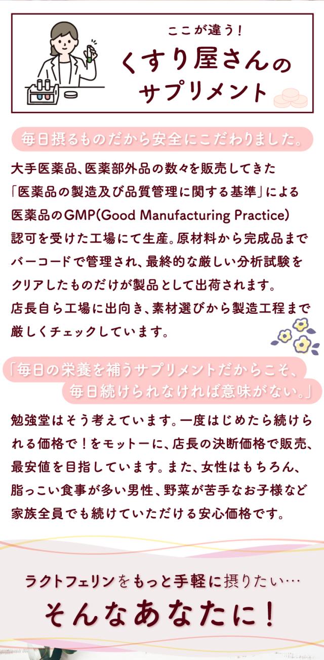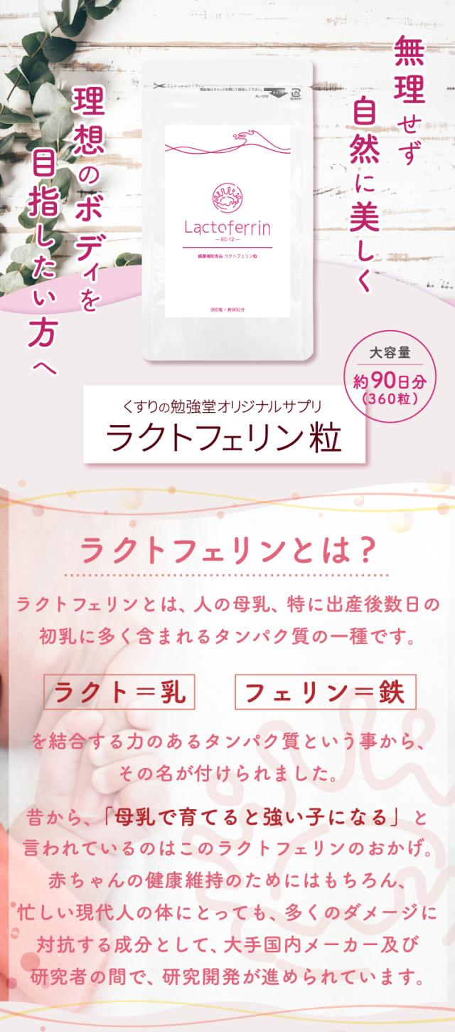 ●原材料名:乳果オリゴ糖、水溶性食物繊維、乳酸菌濃縮物(乳由来)、セルロース、トレハロース、クエン酸、ラクトフェリン濃縮物(乳由来)、ステアリン酸カルシウム、微粒酸化ケイ素、ビタミンC、ナイアシン、ビタミンE、パントテン酸Ca、ビタミンB2、ビタミンB1、ビタミンB6、ビタミンA、葉酸、ビタミンD、ビタミンB12