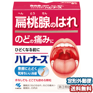 ●水なしでも飲めて、患部に気持ちいい冷感がとどきます 効果・効能 扁桃炎(のどのはれ、のどの痛み)・咽頭炎、口内炎 用法・用量 年齢 1回服用量 1日服用量 成人(15歳以上) 1包 3回 7歳以上15歳未満 1/2包 7歳未満 服用しないで下さい 剤形 顆粒 内容量 9包 成分・分量