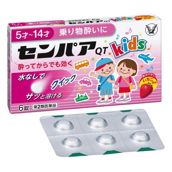 ●センパアQT<ジュニア>は、水なしでかまずにすばやく溶けるタイプのお子さま 用の乗物酔い止め薬です。 ●乗物酔いによるめまい・吐き気・頭痛の症状を予防・緩和します。 ●気分が悪くなってからでもすぐに服用すれば、めまい・吐き気・頭痛をしずめます。