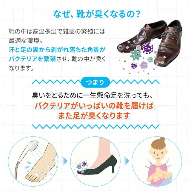 強力な除菌・消臭効果で、靴の中のイヤな臭いの元となるバクテリアを根源から除去します。 効果は長期的に持続します。